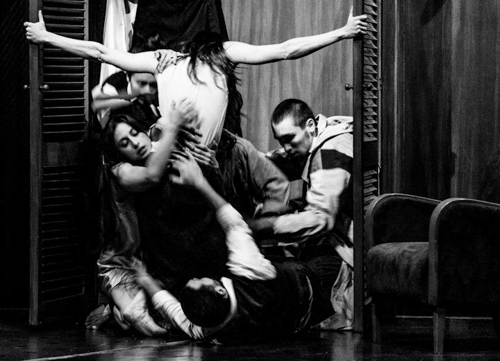 Triptych: The missing door, The lost room and The hidden floor, several characters are wandering through an ocean liner. They set out to seek an ideal, they left filled with hope, but are now lost in this mysterious and macabre labyrinth. The characters live between reality and what’s imagined, guided by natural forces that lead them to an uncertain destiny. Gabriela Carrizo and Franck Chartier create a disturbing, dark and enclosed world – typical in the work of Peeping Tom, while at the same time putting a unique and extreme language of movement and performance at the centre of the pieces.